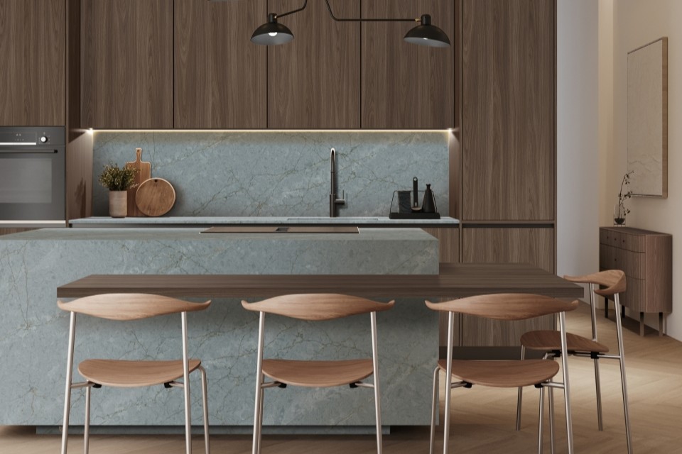 Sapphire Rift is a large-scale diagonal movement design with a marbled background in light blue tones, traversed by thin veins in dark charcoal blues, warm tones, and occasional faint white. Pools of light blue-grey emerge throughout the slab. This design allows for coordination with a wide range of hues and woods.