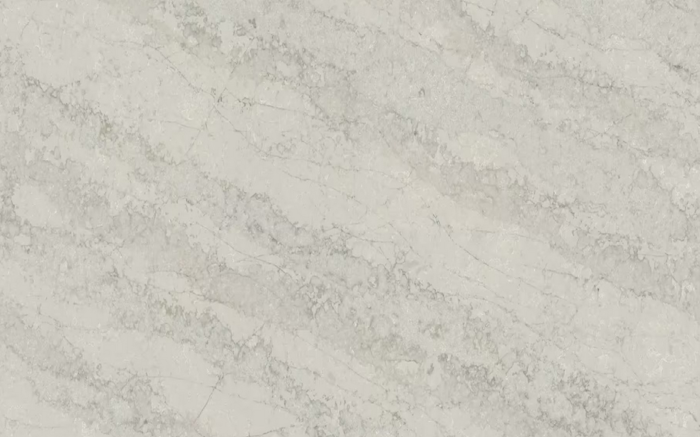 Sandswept Cove is characterized by wide, large-scale directional veins that flow diagonally across the slab and transition between varying tones of darker neutrals and golden taupe, to muted greys and occasional blues that fade in and out of a neutral background. Thin and more contrasting veins appear sporadically on this design.