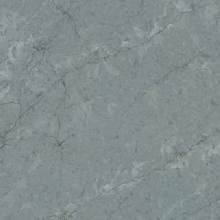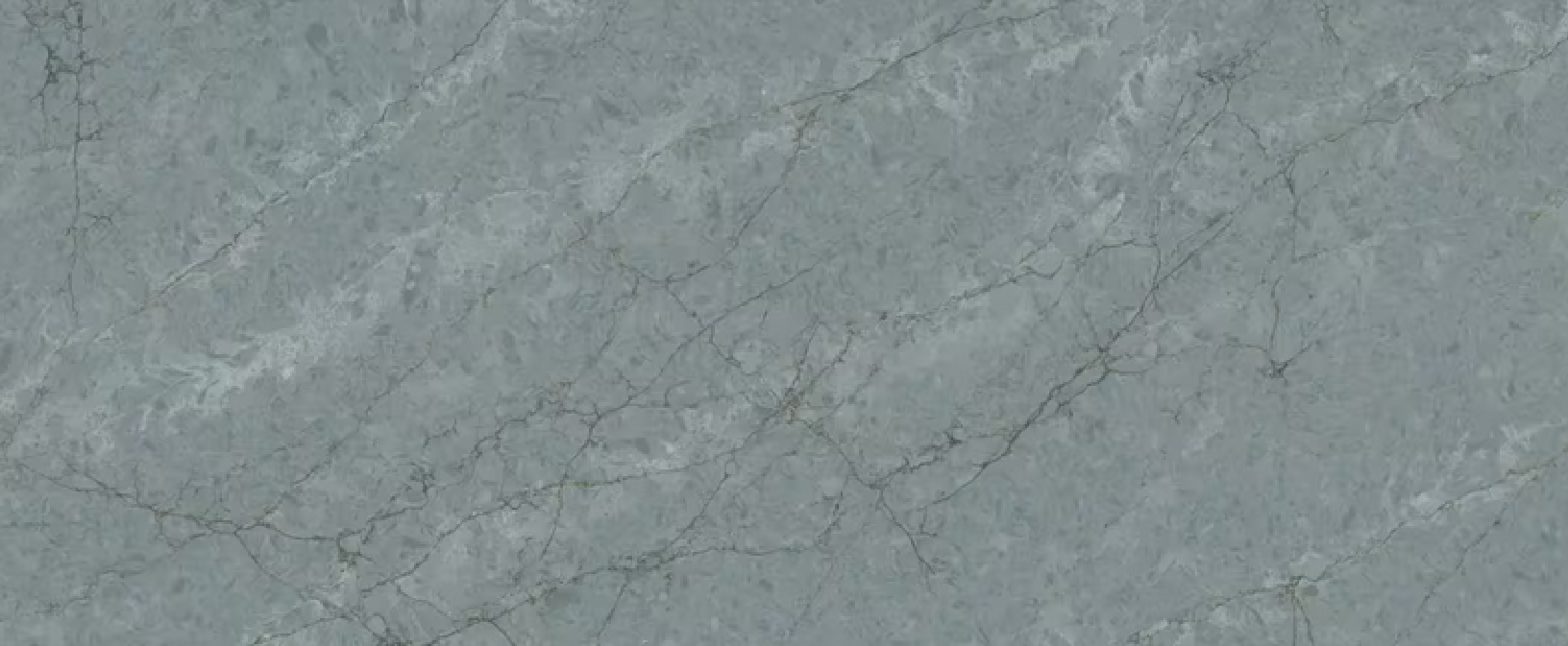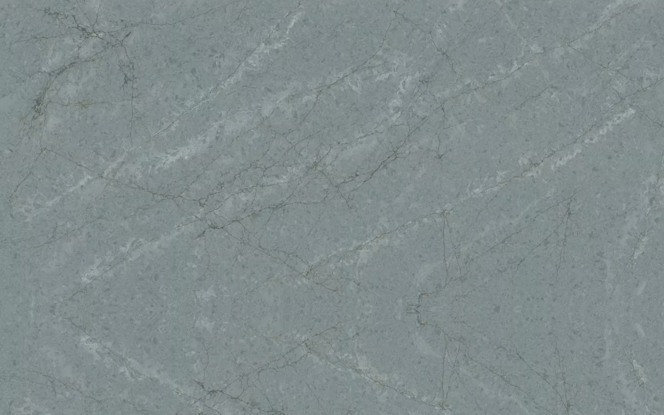 Sapphire Rift is a large-scale diagonal movement design with a marbled background in light blue tones, traversed by thin veins in dark charcoal blues, warm tones, and occasional faint white. Pools of light blue-grey emerge throughout the slab. This design allows for coordination with a wide range of hues and woods.
